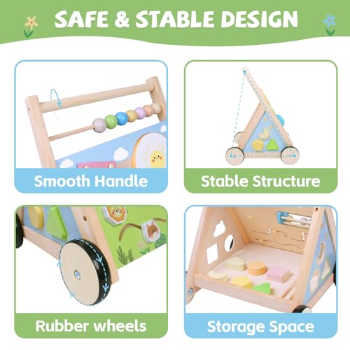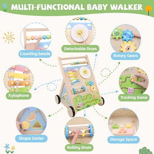 Multi-functional Montessori Walker – Interactive Play & Activity Center: More than just a walking aid, this wooden baby push walker with wheels combines fun and learning with 7 engaging activities and a storage space. Featuring a detachable drum, a xylophone, a rolling drum, rotary gears, tracking mazes and counting beads, the baby activity center for baby can keep your little one entertained for hours