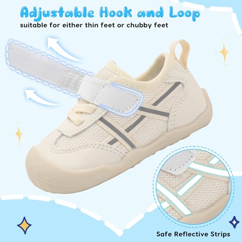 Feature: Lightweight, breathable, adjustable Uppers: Breathable Mesh upper Outsole: Rubber outsole with nonslip texture Closure: Adjustable hook and loop closure Occasion:The baby boys girls shoes is great for indoor and outdoor activities, such as first walking, playing in kindergartens, walking in the parks, having a camping trip, and playing around the house, etc