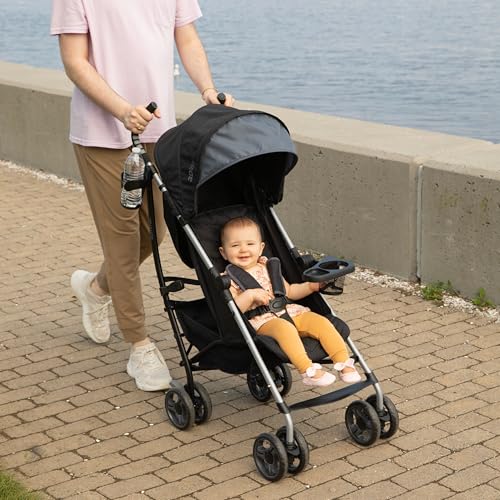 Keep things light for your family’s everyday adventures with the Summer by Ingenuity 3Dlite Convenience Stroller. Weighing in at just over 14 pounds, this lightweight stroller features an easy-to-fold compact frame that makes it easy to stow and go. Little ones will feel comfortable and secure thanks to its multi-position recline, a 5-point safety harness, and an extended pop-out sun visor with UPF 50+ made from recycled fabrics that help protect their delicate skin. An integrated child cup holder and snack tray folds with the stroller for the ultimate convenience. Parents will enjoy a cup holder, a convenient storage pouch, an easy-to-access storage basket, cushioned handles, a carry strap, and lockable rear wheels for safety. Take your tot for a super-smooth ride thanks to anti-shock front wheels (maximum weight for toddlers is 50 pounds). Whether you’re taking a spin around the neighborhood or strolling through the airport, the 3Dlite is the ideal stroller for travel or every day.