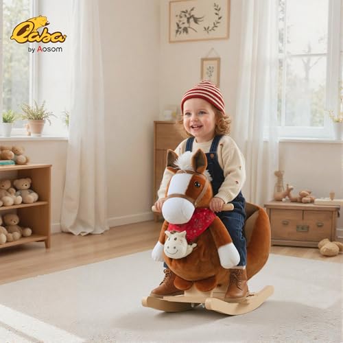 Qaba Kids Ride-On Rocking Horse Toy, Rocker with Lullaby Song, Hand Puppets & Soft Plush Fabric for Children 18-36 Months, Brown