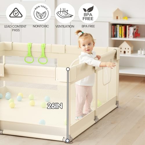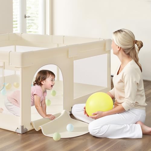 Uanlauo Beige Small Baby Playpen – 47x47in Playpen for Babies and Toddlers, Safe Indoor Play Pen, Baby Pen with Storage Bag and Breathable Mesh