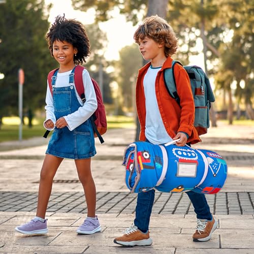 Primlect Thickened Toddler Nap Mat with Removable Pillow and Minky Blanket, Extra Large 55”x35” Sleeping Bag, Washable, Roll up, Perfect for Daycare, Preschool, Kindergarten, Boys and Girls Blue Car