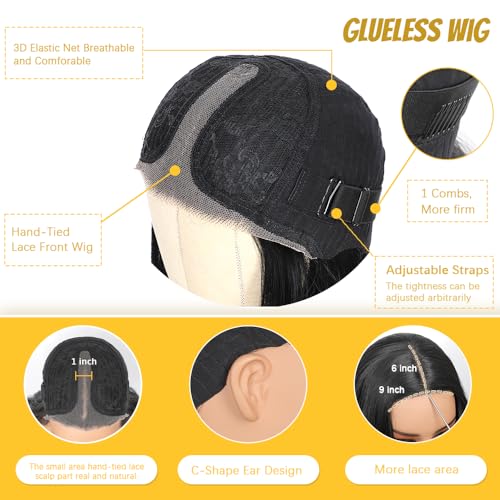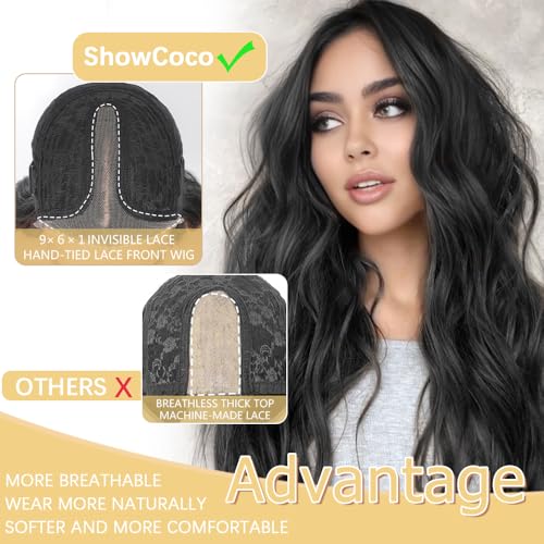 ShowCoco Black Wig for Women 26 Inch Pre Cut Hand-Tied Lace Long Wavy Natural Hairline Middle Part Hair Replacement Wigs for Women Beginners Natural Synthetic Wig for Daily Party 3 Seconds to Wear