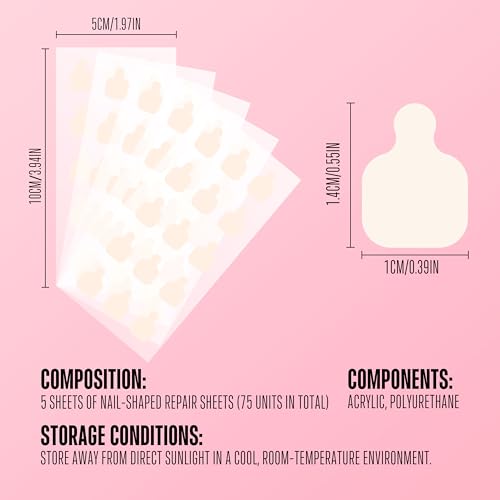 One package Includes 5 PCS Nail Shaped Nail Repair Sheet, each sheet contains 15 pre-designed nail shape units. The total is 75 units. COMPONENTS: Acrylic, polyurethane SIZE: 5cmx10cm per sheet Way of Using: Professional Salon or DIY Nail products are not for children, Please be kept out of reach of children to avoid swallowing and injury.