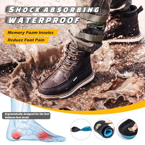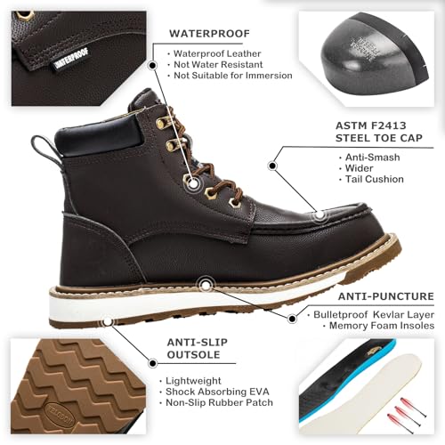 KELODON Waterproof Steel Toe Boots For Men-6″ Leather Moc Toe Winter Warm Work Boots Mens Steel Toe Shoes Indestructible Non Slip Resistant Construction Safety Boot