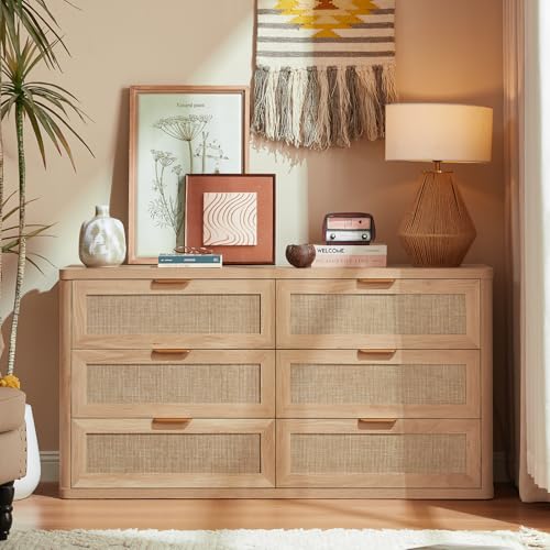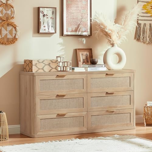 LEYAOYAO Rattan 6 Drawer Dresser for Bedroom, Boho 54″ Wide Natural Wood Dresser Chest of Drawers, Dressers TV Stand with Metal Handle, Storage Dressers Closet Organizer for Living Room, Hallway