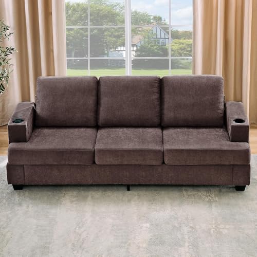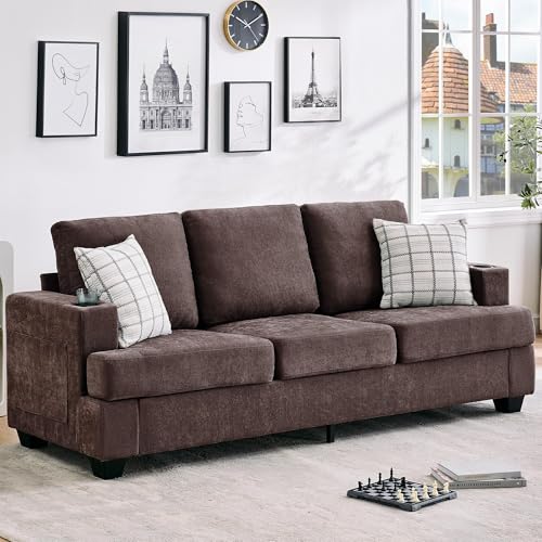 GarveeHome Modern 89 in 3-Seater Sofa for Living Room, Comfy Couches with Deep Seat, Chenille Couch with Cup Holders and Side Storage Pockets for Apartment Lounge, Brown