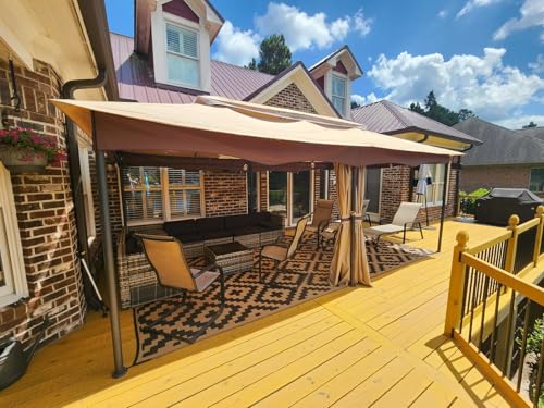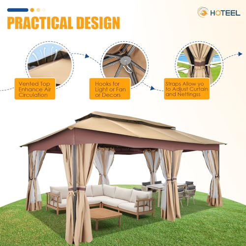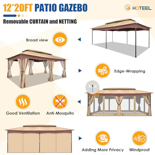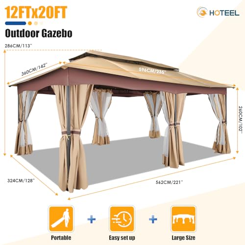 HOTEEL 12×20 Gazebo, Outdoor Gazebo on Clearance with Double Ventilated Arc Roof, Privacy Curtains & Mosquito Netting, Easy Set up Canopy Tent with Stable Resistant to Strong Winds Metal Frame Khaki