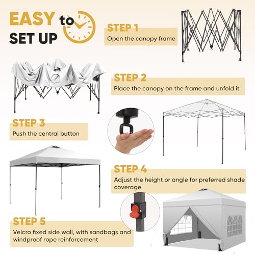 Saemoza 12×12 Pop Up Canopy Tent with One Push Setup, Portable Sun Shade Tent, Instant Easy Up Canopy with 4-Sidewalls & Wheeled Bag, Outdoor Fldable Gazebo with Vent Top, White.