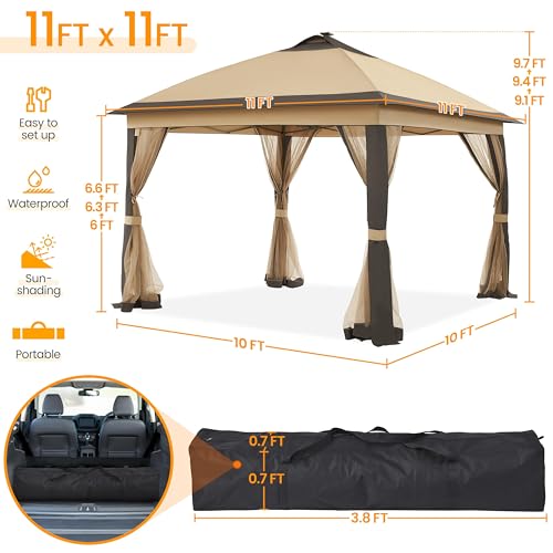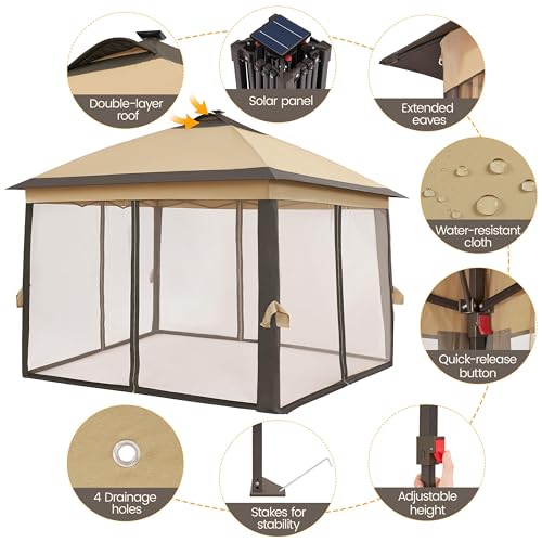 Yaheetech 11’x11′ Pop Up Gazebo Instant Tent with 17 Solar LED Lights & Zippered Mesh Netting, Outdoor Shelter Sun Shade Gazebo with Sandbags for Backyard Garden Patio, Khaki & Brown