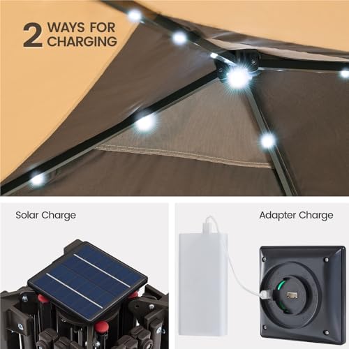 Built-in Solar LED Lights: This 11ft × 11ft gazebo tent features seventeen LED lights, powered by a solar panel or power bank (not included). Control brightness and settings with the remote for added ambiance