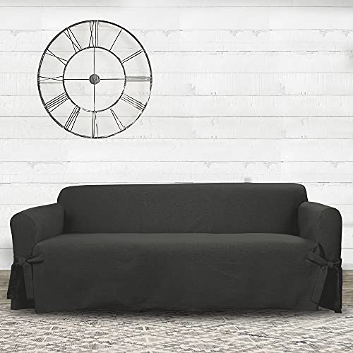 SureFit Farmhouse Basketweave Faux Linen Sofa Slipcovers, Couch Cover One Piece Design and Straight Skirt, Removable and Machine Washable Sofa Cover, Charcoal