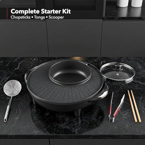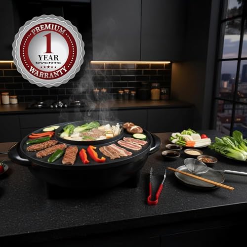 OVENTE Electric Hot Pot and Grill Combo, 2-in-1 Portable Countertop Cooker with Temperature Control Perfect for Korean BBQ, Shabu Shabu and Soup with Free Strainer, Chopsticks and Tong, Black GH10133B