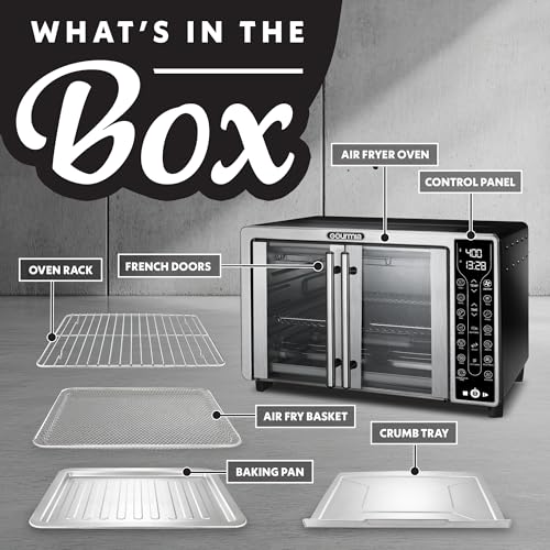 Gourmia French Door Air Fryer – 25 Qt Large Capacity Convection Oven, Fryfroce 360°, Digital Display with 17 Cooking Presets, Bake, Toast, Roast, Dehydrate, Fits 12” Pizza