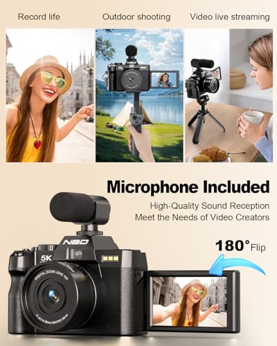 NBD 5K Digital Cameras for Photography,64MP Camara Fotograficas,Travel Vlogging Cameras for YouTube with 180°Flip Screen,16X Digital Zoom,52mm Macro Lens,2 Batteries,64GB TF Card(Black)