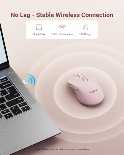 【Plug & Play】Simply plug in the USB receiver for instant connectivity—no drivers needed. The stable 2.4GHz wireless technology ensures reliable performance within 33ft (10m), free from interference. (Note: USB receiver is stored at the bottom of the mouse)